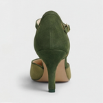 The Coralise is a study in contrast — deep forest green suede meets sage, with gold metallic accents that catch the light just right. The T-bar strap keeps things structured without trying too hard. The kitten heel gives you height without compromise. The rounded toe feels modern without chasing trends.