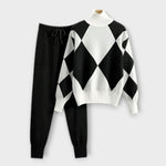 This fashionable knit set for women combines style, comfort, and elegance in one. The jumper features a striking diamond pattern, and the comfortable trousers with an elastic waistband and pockets offer a harmonious blend of casualness and sophistication. Perfect for cosy days at home or stylish leisure looks on the go.